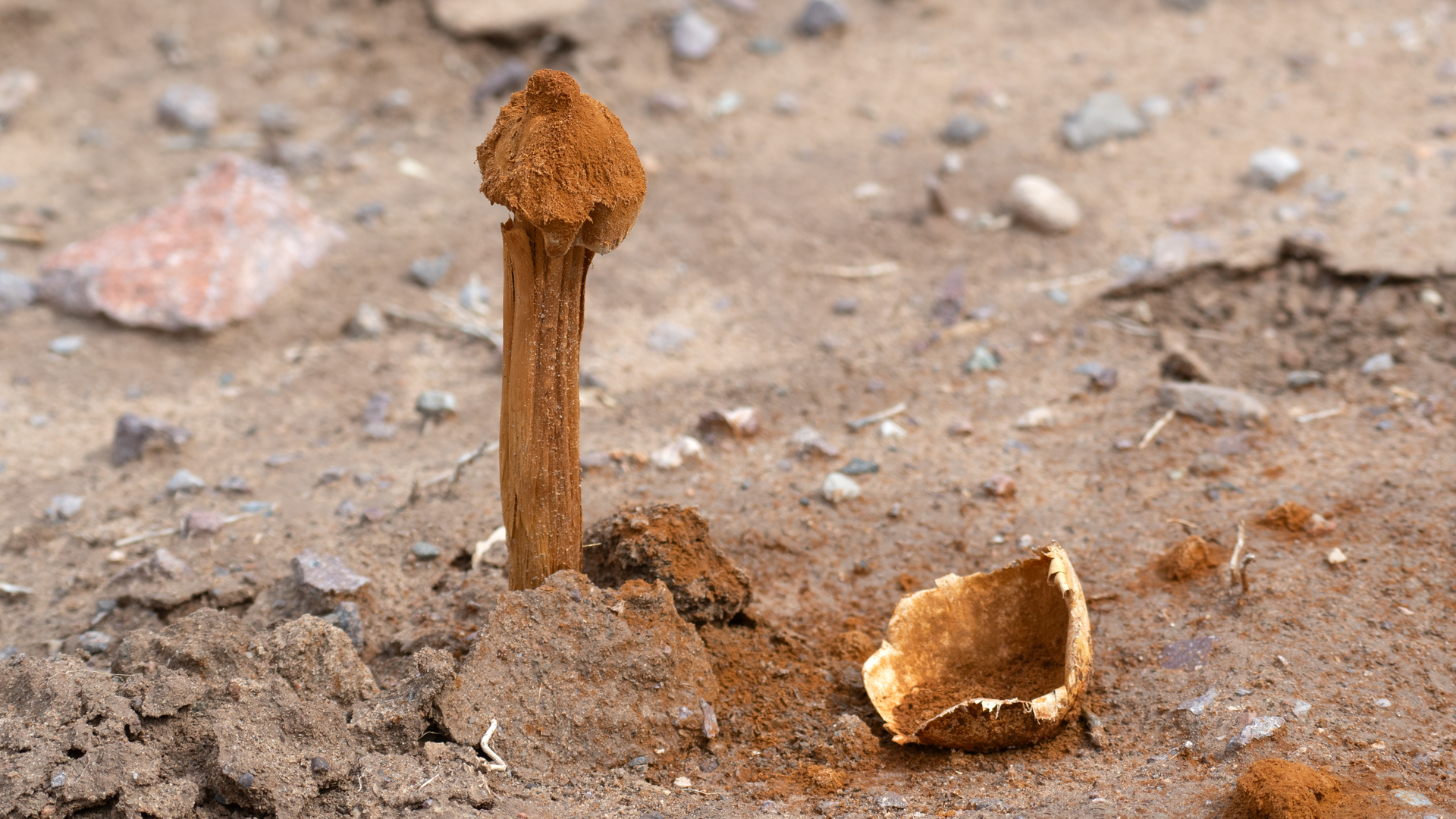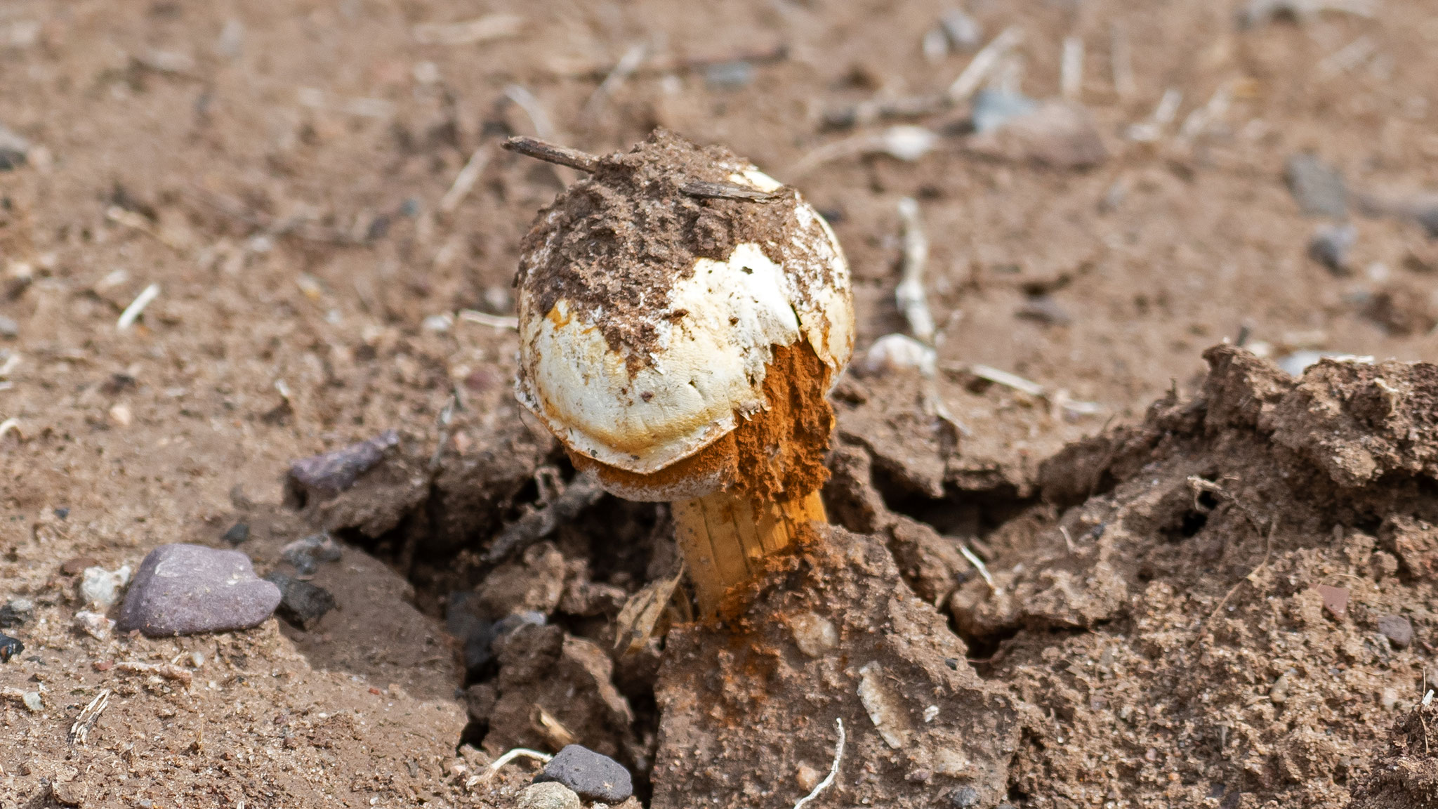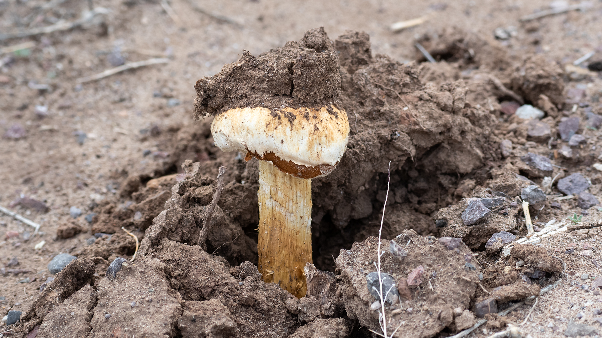 This mushroom pushes its way up with enough force to break up the soil immediately around it. At first it has a "cap" but that falls away, making it easier for the countless spores to disperse.